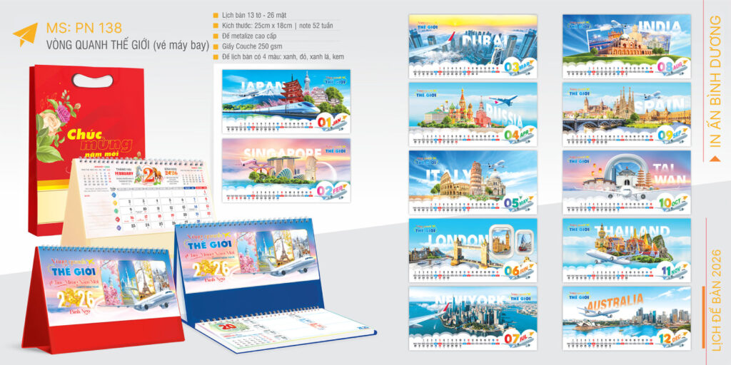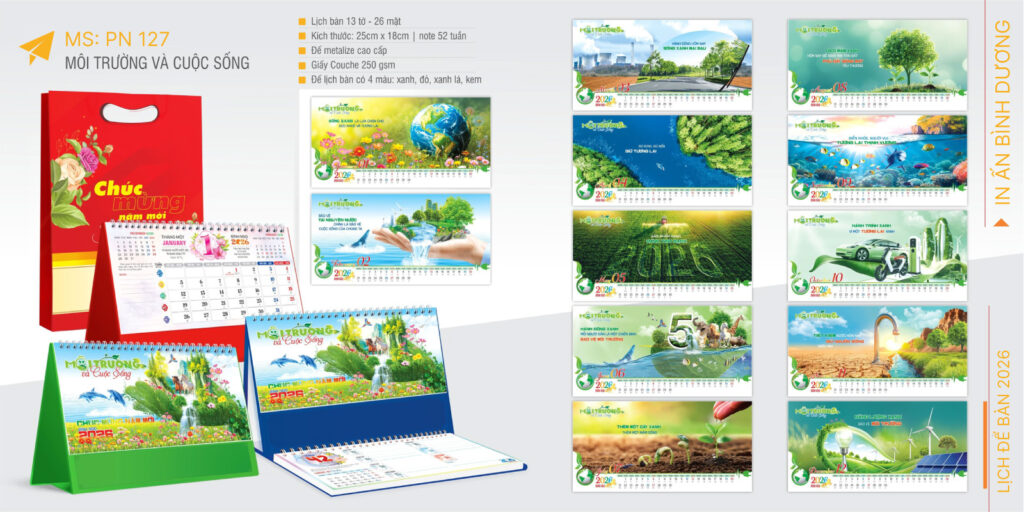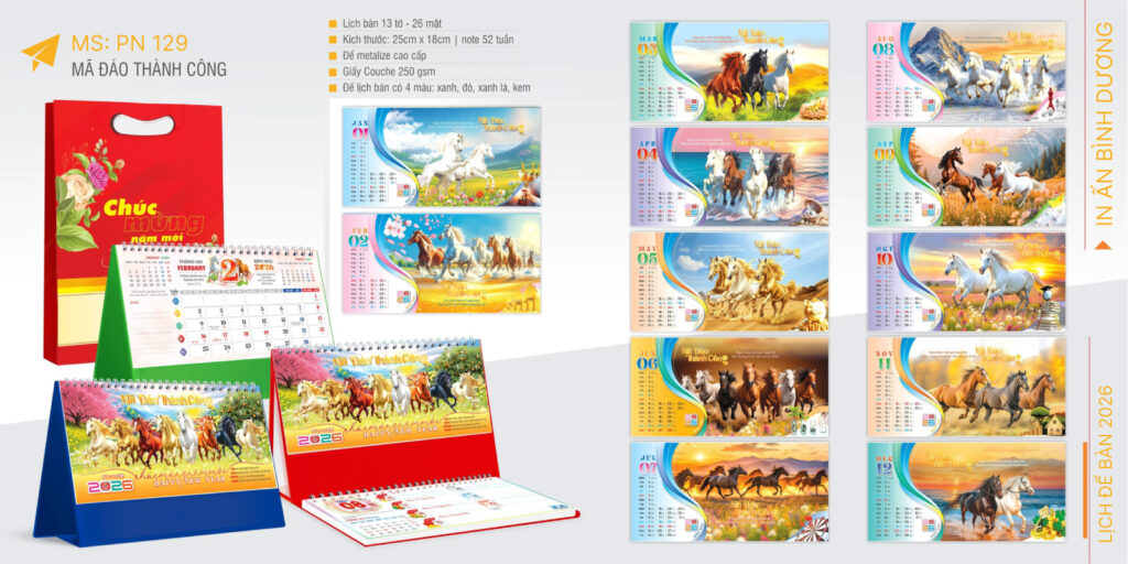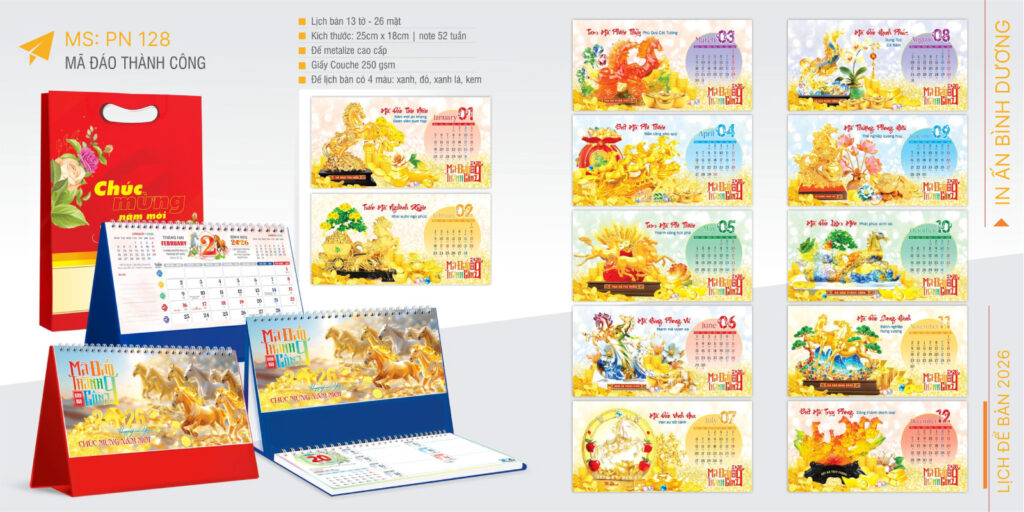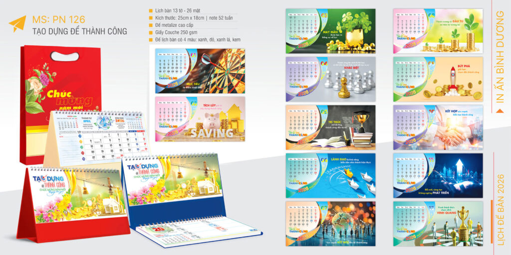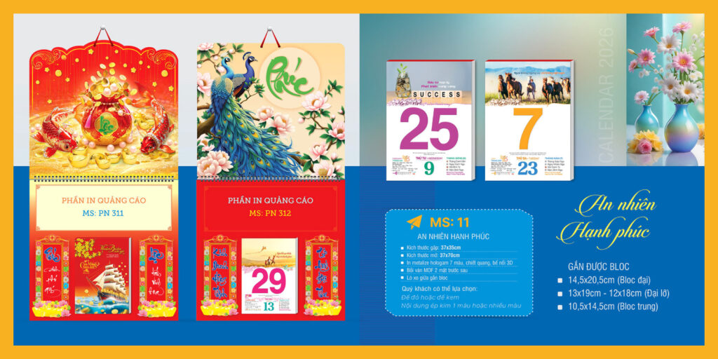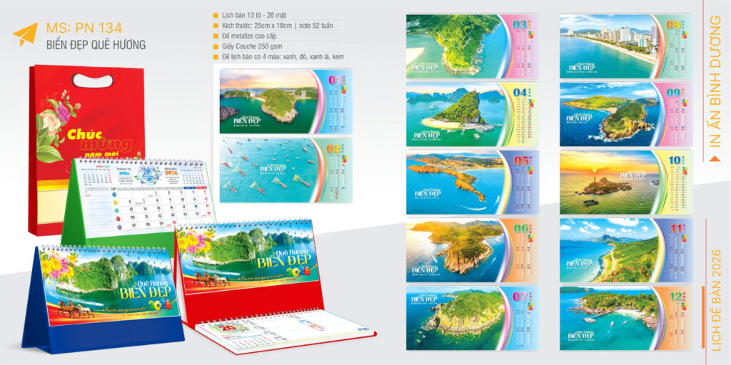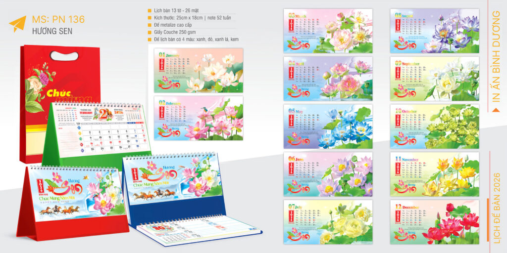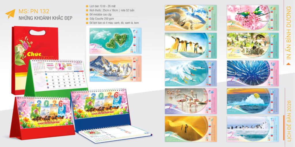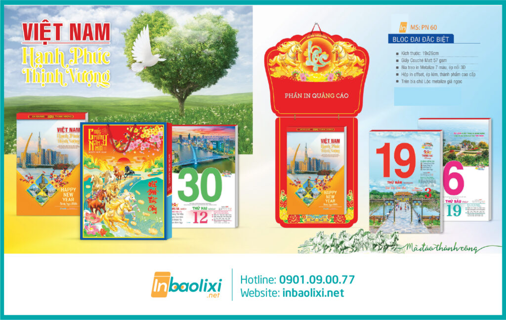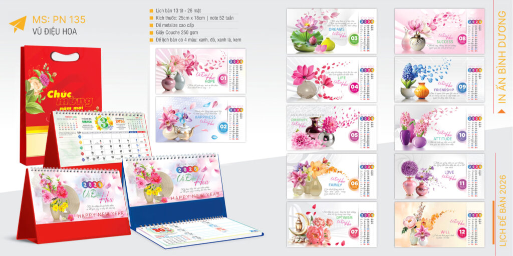 Chúng tôi luôn hy vọng với những mẫu lịch để bàn 2025 của mình, Quý khách sẽ ghi lại một năm tròn tình, vẹn ý khi gửi tặng đến người thân, bạn bè, đối tác cuối năm một cuốn lịch đầy ý nghĩa. Những mẫu lịch để bàn đẹp được In ấn Bình Dương trân trọng giới thiệu trong mùa lịch 2025, quý khách có thể tham khảo trong trang này, như bộ lịch để bàn An Nhiên thông điệp truyền tải về một cuộc sống an nhiên là điều rất nhiều người quan tâm và theo đuổi. An nhiên giúp chúng ta vững vàng trong cuộc sống, tự tin về chính mình, gạt bỏ những đố kỵ, thù hận, tham lam để mọi sự tốt đẹp dần theo năm tháng, Thịnh Vượng Việt Nam Sáng Ngời tôn vinh một Việt Nam phồn thịnh, tươi đẹp và phát triển, một Việt Nam văn hiến ngàn năm cũng đồng thời vươn tầm 5 châu. Bộ lịch Sắc Hoa Mùa Xuân, mỗi bông hoa hiện hữu trên trái đất này không chỉ hấp dẫn bởi hương sắc quyến rũ, dáng vẻ yêu kiều mà còn bởi ý nghĩa, thông điệp mà chúng gởi đến người thưởng ngoạn. Hoa là biểu tượng của cái đẹp. Hoa làm khu vườn thêm rạng rỡ, góp cho không gian sống sự tươi mới ngọt ngào… và rất nhiết bộ lịch để bàn khác.