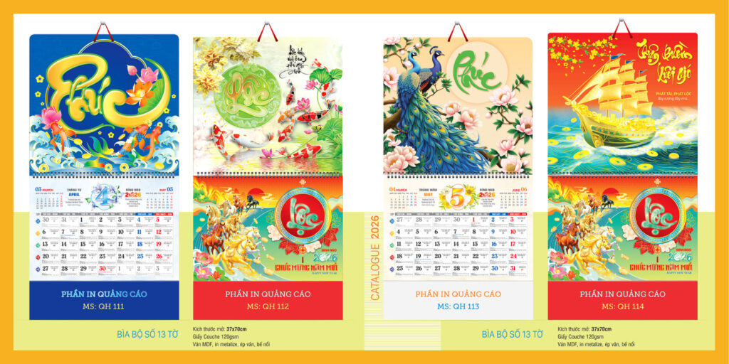 Dưới đây là những mẫu bìa lịch đẹp 2025 được cung cấp trong năm nay. Chủ đề phong phú, đa dang, những câu đối chân lịch được kéo tia UV cao cấp, chữ lộc – phúc thúc nổi giả cẩm thạch. Hình ảnh những chú rắn vàng năm Ất tỵ được cách điệu lên lịch hài hòa hơn tạo sự phá cách trong mẫu bìa lịch. Đây là năm thứ 8 liên tiếp lịch In ấn Bình Dương đồng hành cùng quý khách hàng – trân trọng mang đến những ấn phẩm lịch tết ấn tượng, đẹp mắt, giàu tính nghệ thuật, nhân văn, hiện đại và thiết thực. Là công ty in lịch tết có nhiều năm kinh nghiệm, chúng tôi hoàn toàn có thể thấu hiểu khách hàng và sản phẩm, mọi công đoạn sản xuất đều trơn chu và nhanh chóng hoàn thành sản phẩm một cách hoàn hảo nhất. Kính mời Quý khách xem mẫu lịch: